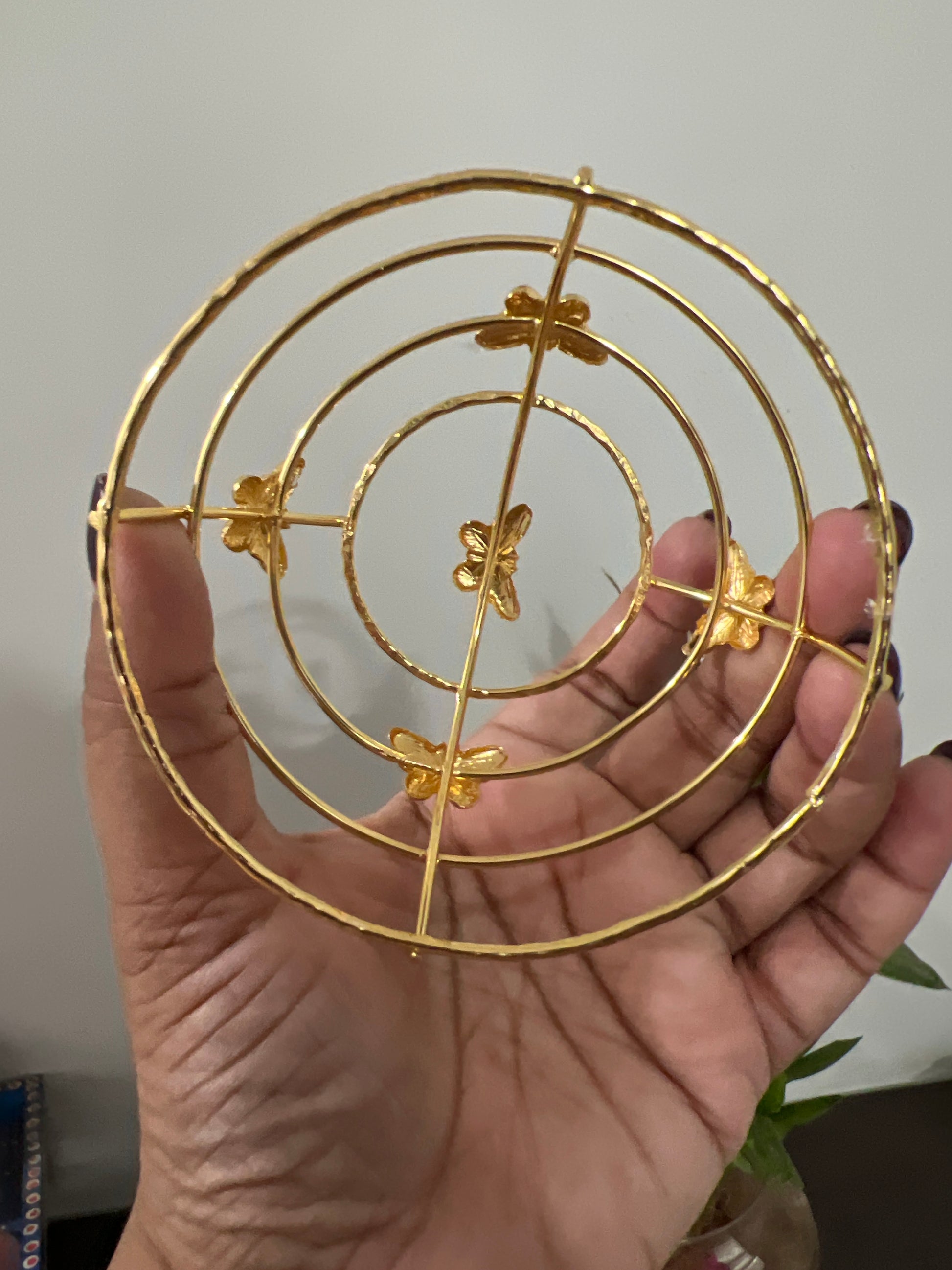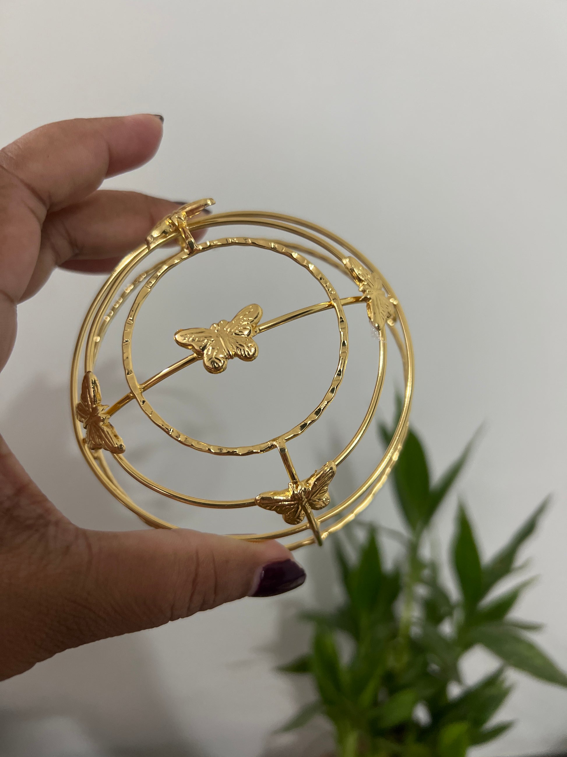 Elevate your hairstyle with this elegant gold-toned butterfly hair bun accessory. Crafted with intricate detailing, this accessory features a unique circular design made up of three concentric rings, with a delicate butterfly perched at the center and four additional butterflies evenly spaced around the outer ring. The metallic gold finish adds a touch of luxury and sophistication, making it perfect for traditional as well as contemporary