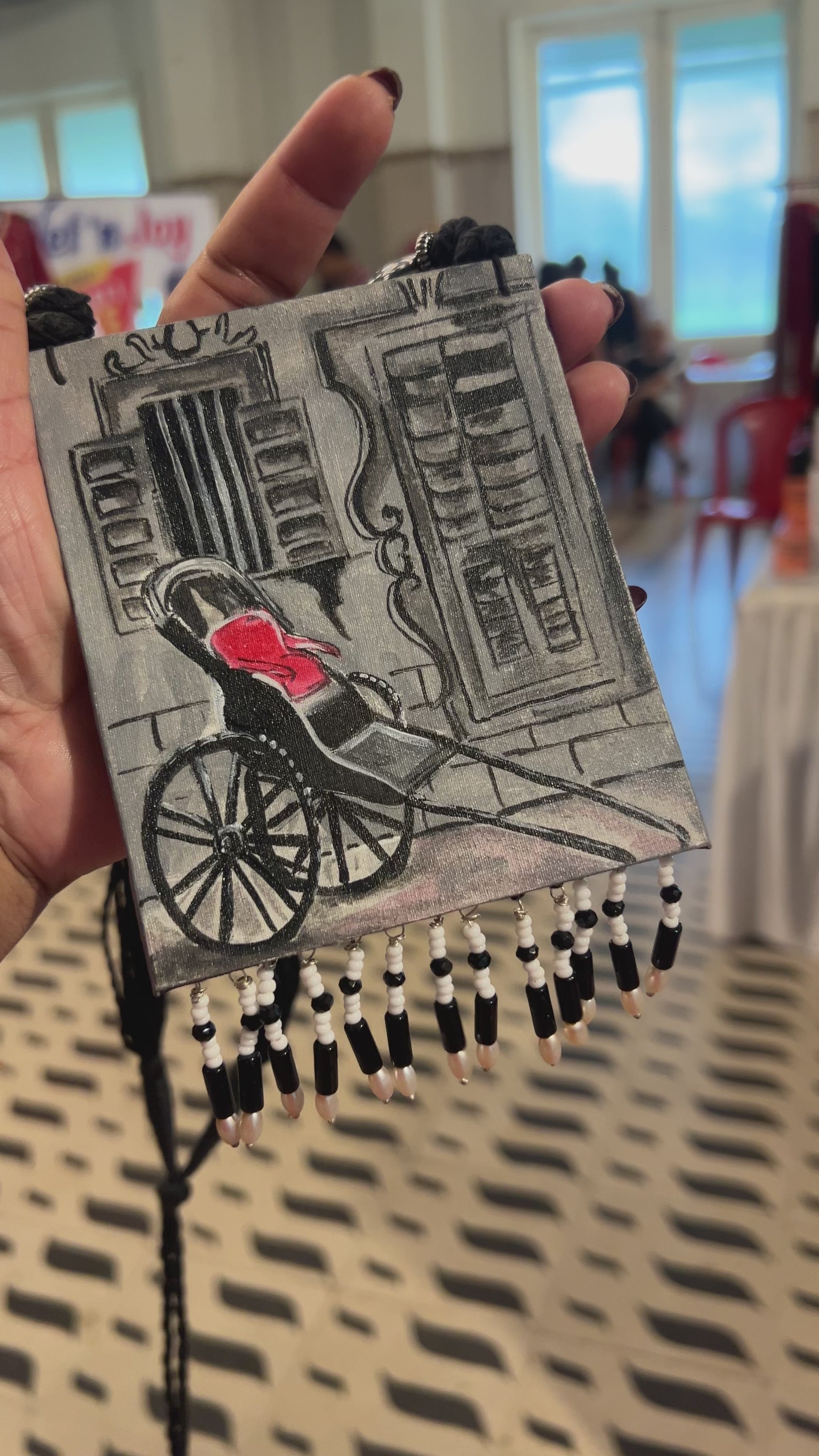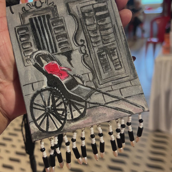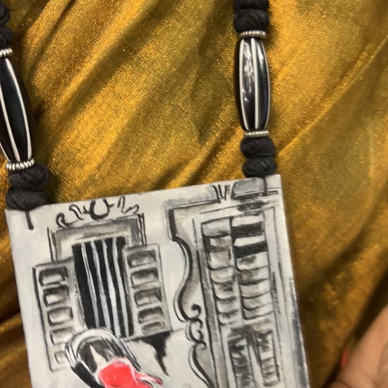 This handcrafted Kolkata hath rickshaw jewellery set is a unique and beautiful addition to any outfit. Made with cardboard and Aleylic colours, this necklace set showcases traditional artistry and attention to detail. Bring a touch of cultural heritage to your wardrobe and support sustainable, handmade craftsmanship with this stunning set.