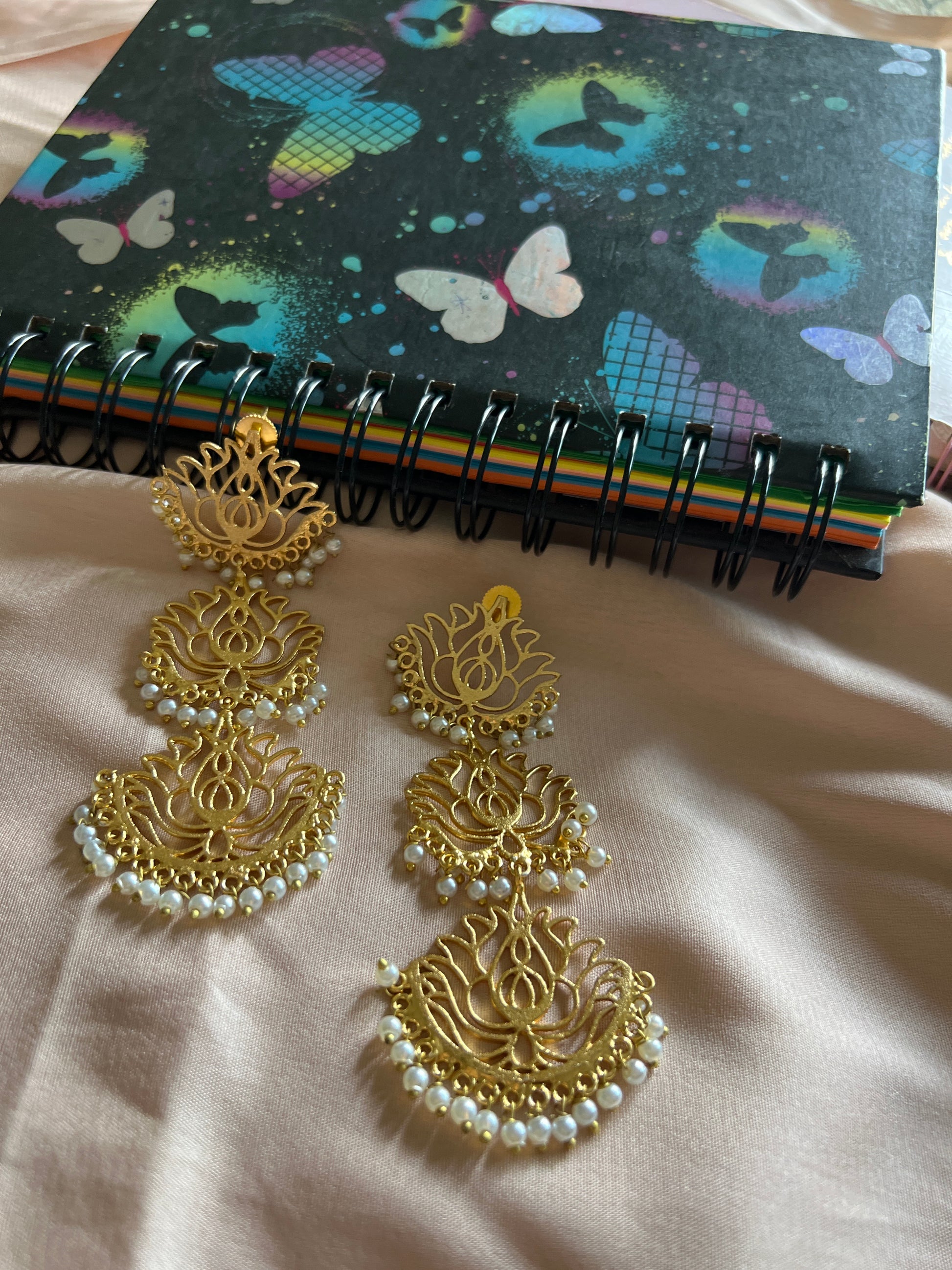 Elegant and eye-catching, these handcrafted earrings feature a trio of delicately layered lotus blossoms, symbolizing purity, rebirth, and spiritual growth. Cast in warm, golden-hued brass, they offer a timeless charm with a lightweight feel — perfect for all-day wear.