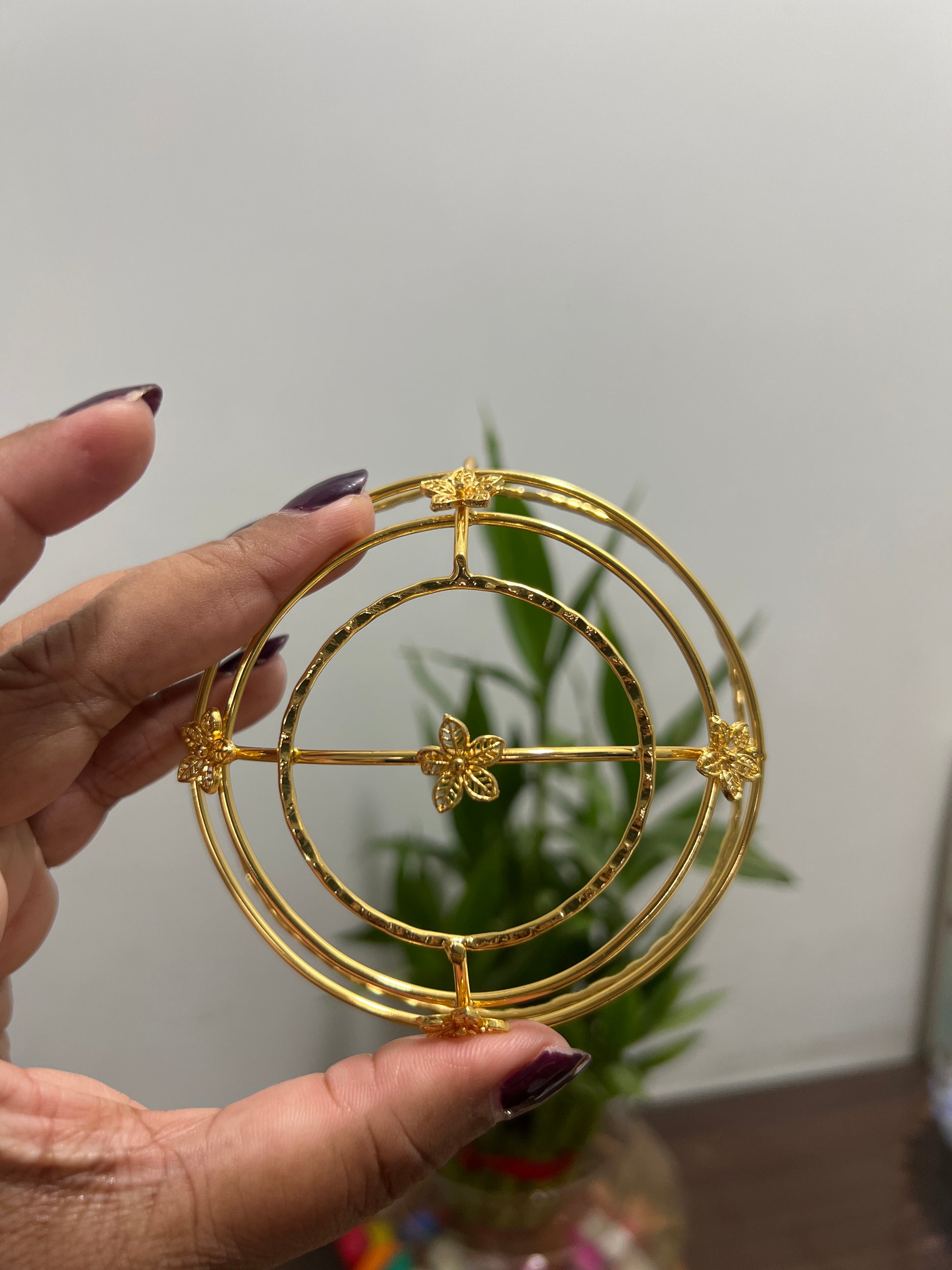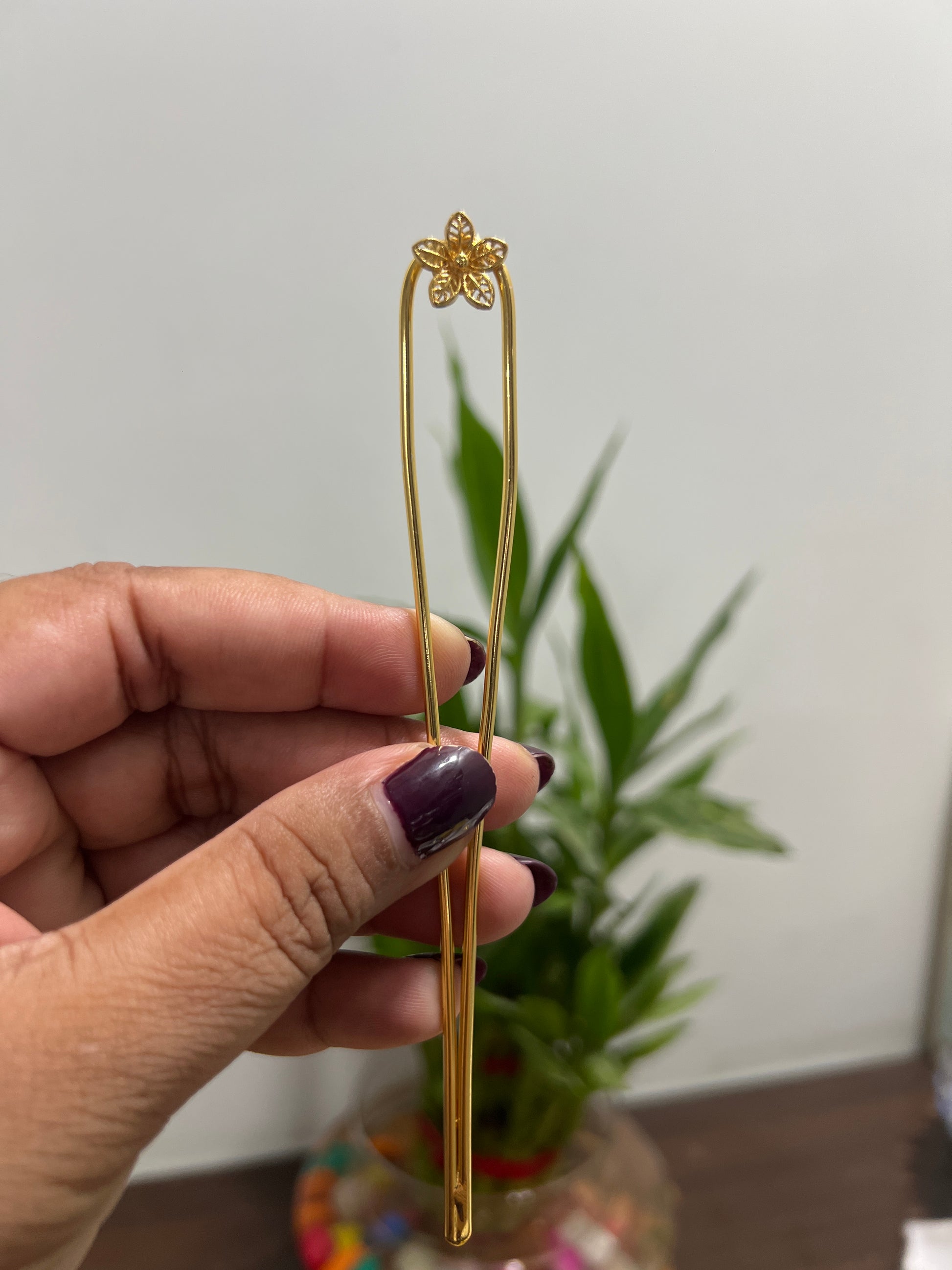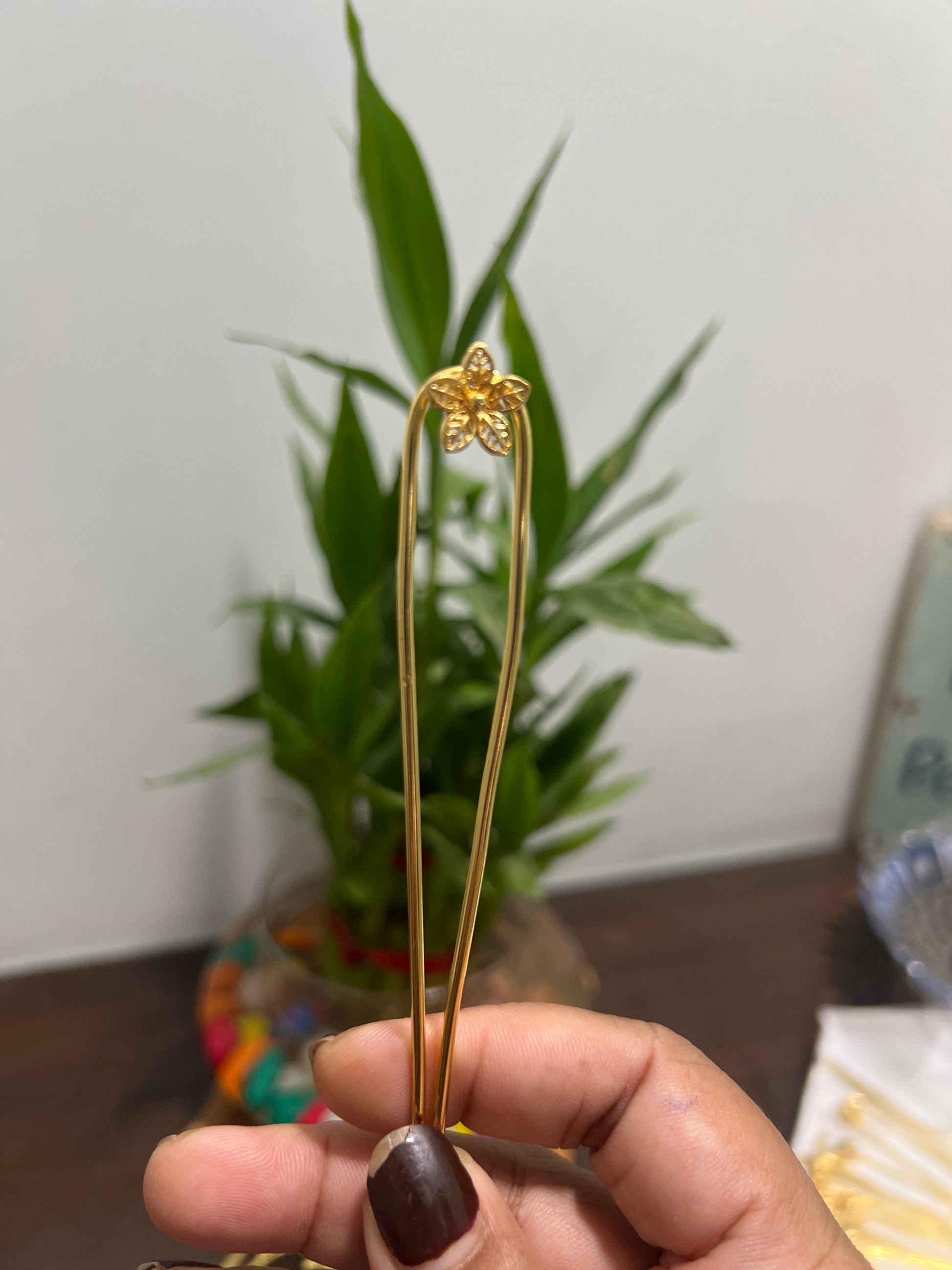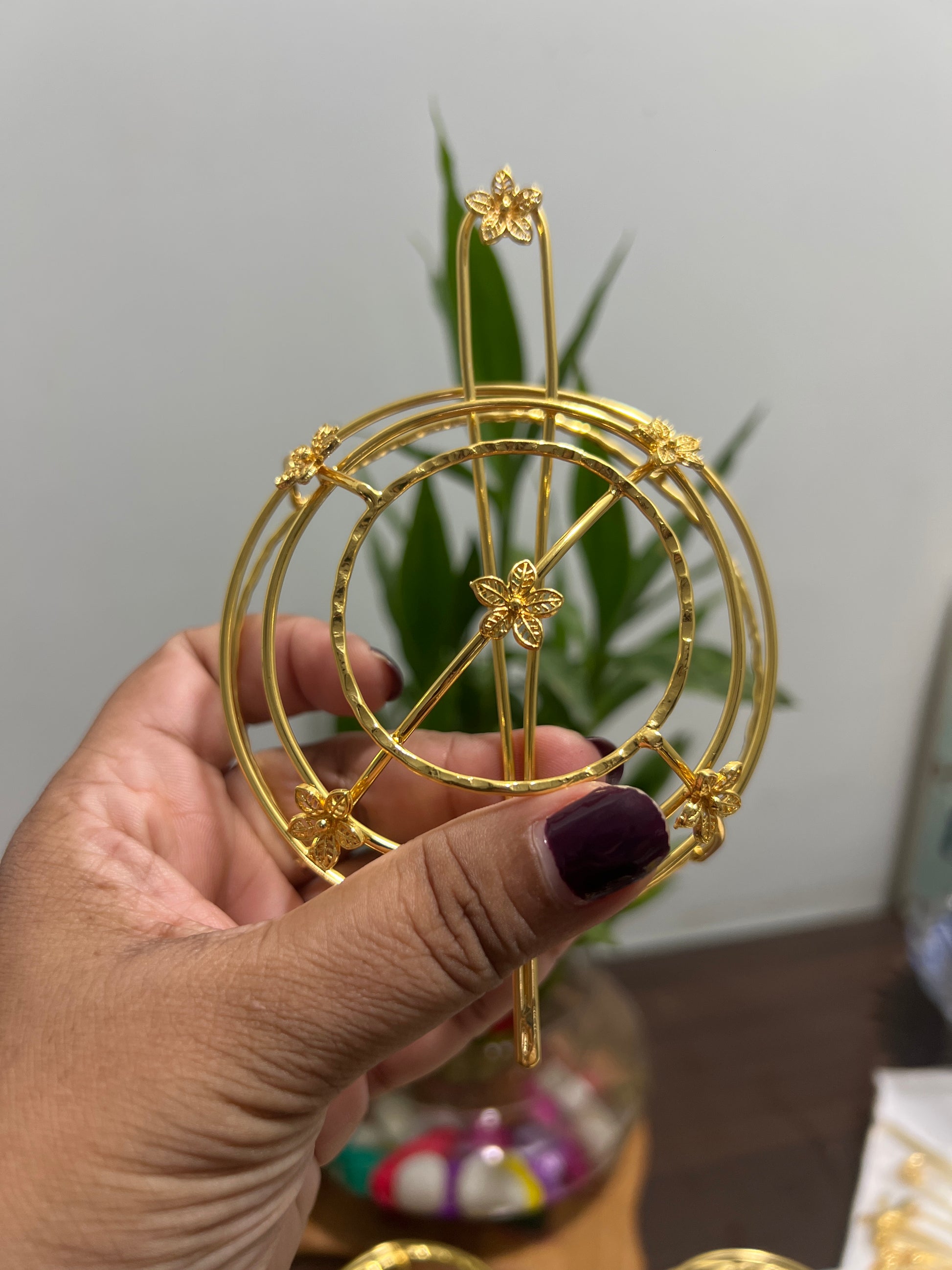 Gracefully handcrafted, this intricate bun accessory blends classic design with floral elegance. The delicate hammered finish, radiant gold tone, and charming flower motifs make it the perfect companion