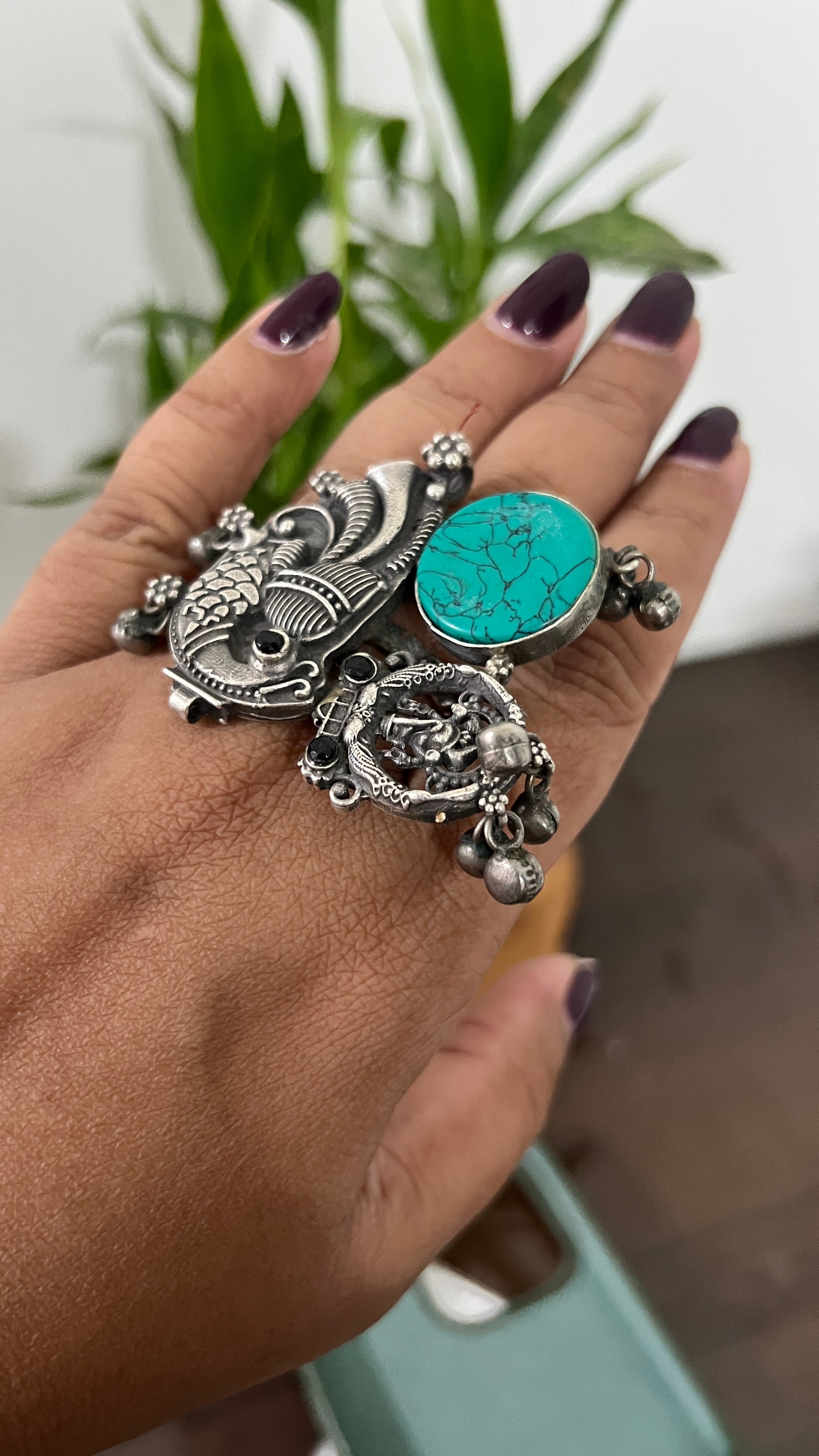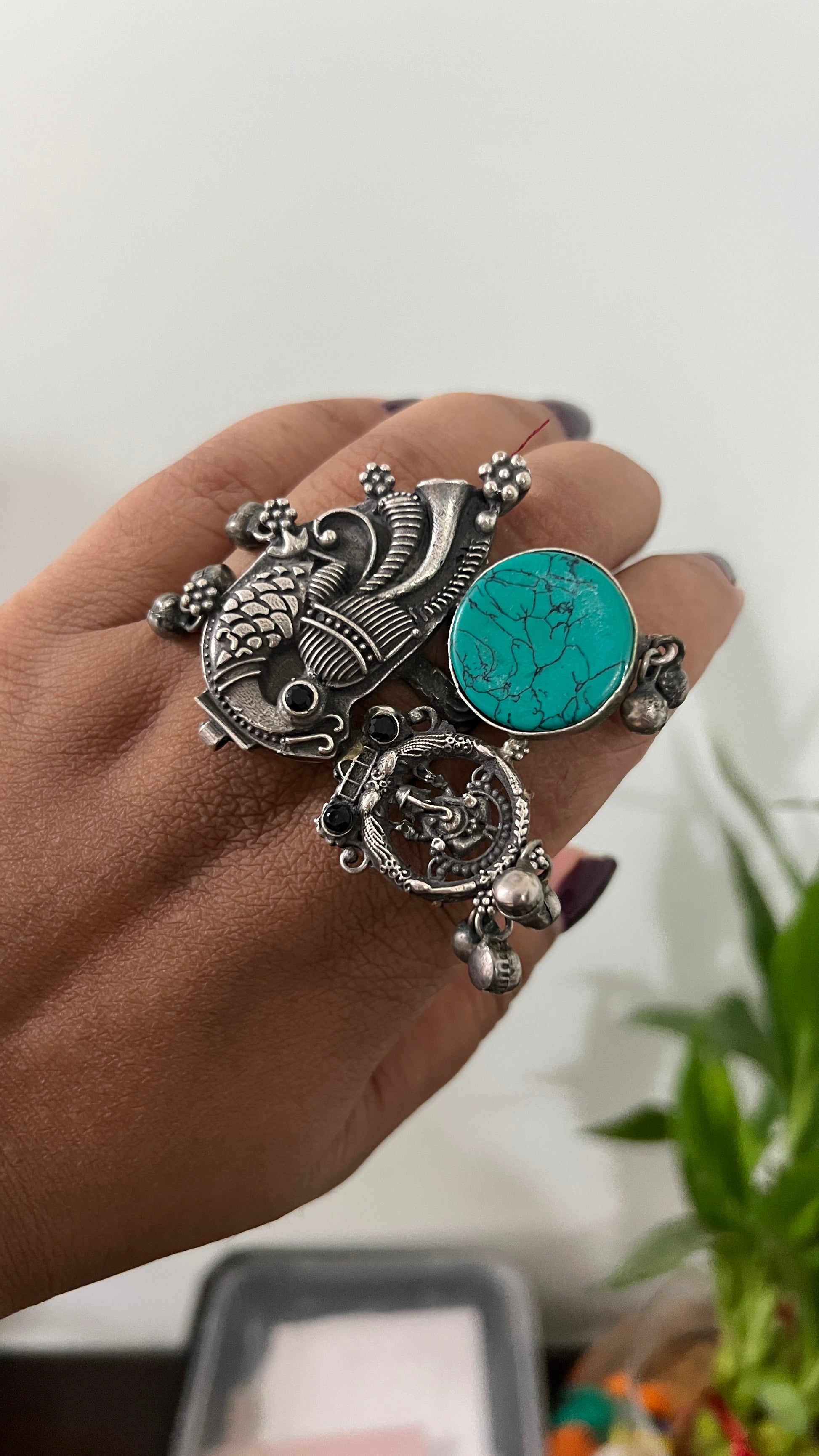 Make a bold impression with this intricately designed oxidized silver statement ring. Featuring traditional Indian motifs including a detailed fish and peacock, this ring blends heritage charm with modern flair. A vibrant turquoise stone adds a pop of color and a touch of bohemian elegance, while tiny ghungroo-style beads offer subtle movement and a playful jingle.